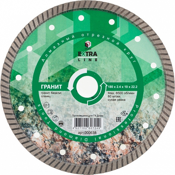 Алмазный отрезной круг Diam Extra Line Turbo Гранит 180 мм (Диам Экстра Лайн Турбо Гранит 180 мм) – специальный алмазный диск тип Turbo для сухой резки гранитов, базальта, сланца и других твердых материалов.