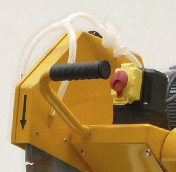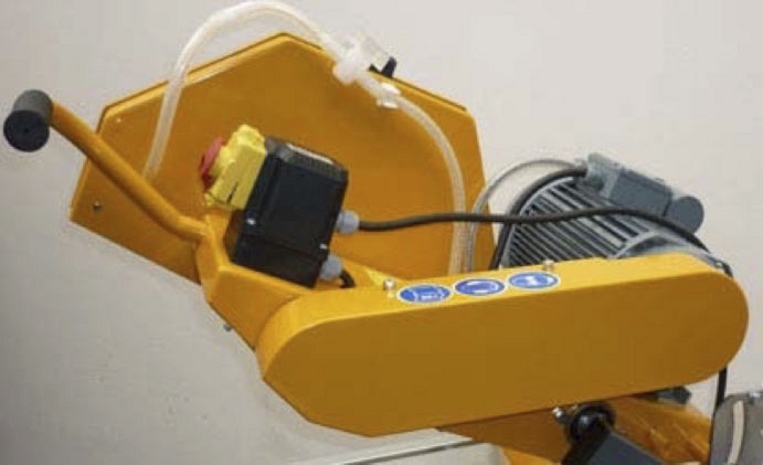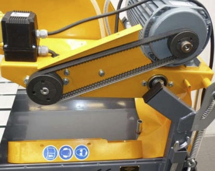 - Привод вращения диска через клиновые ремни с устанавливаемым на заводе-изготовителе передаточным отношением для получения требуемой частоты вращения режущего вала, от электродвигателя мощностью 3 кВт (230 В) или 4 кВт (400 В) и подача воды с помощью электрического погружного насоса из ведра 20 л или водяной ванны на 35 л. Механизм привода и частота вращения вала спроектированы таким образом, чтобы обеспечить оптимальные условия для резания алмазными дисками