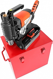 - Поставляется в удобном для хранения и транспортировки металлическом ящике с бачком для принудительной подачи СОЖ, универсальной реверсивной ручкой подачи корончатого сверла, ремнем безопасности и шестигранным ключом