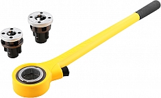Особо прочный. Высококачественный храповый рычаг изготовлен из стали, покрыт толстым слоем пластика со специальным покрытием, предохраняющим от скольжения инструмента в руке, приятно и удобно держать во время работы. Легко регулируемое направление вращения трещотки. Удобная, надежная посадка быстросменных головок, легко вставлять и снимать. - Быстросменные резьбонарезные головки: